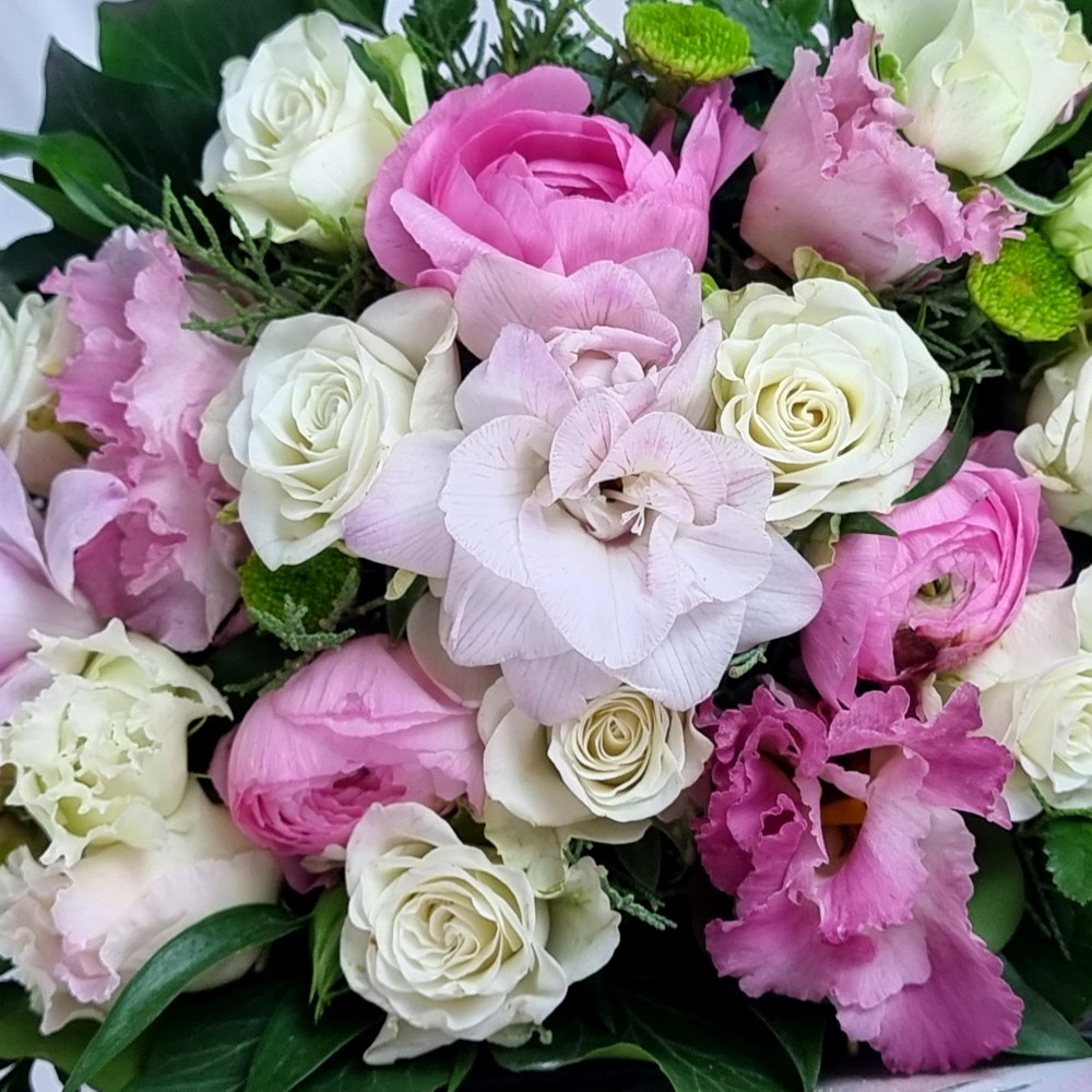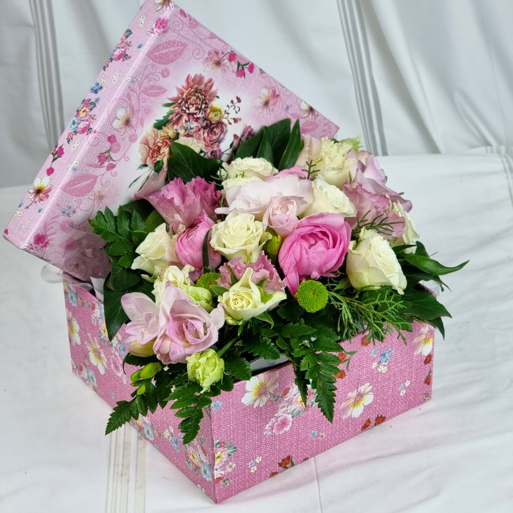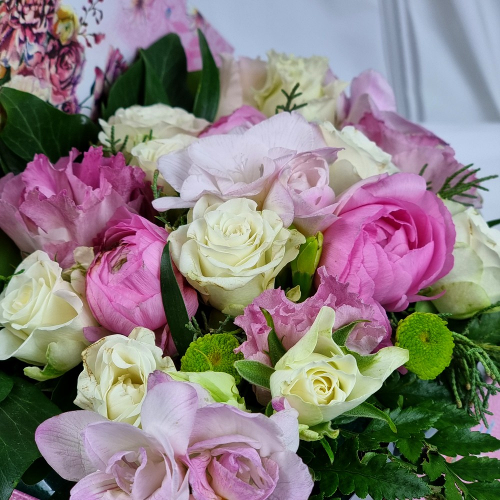 Ez a romantikus és nőies virágkompozíció a gyengédség és a finomság megtestesítője. A rózsaszín, virágmintás dobozban elhelyezett virágok harmonikus pasztell árnyalatokat alkotnak. A főszereplők a rózsaszín és krémszínű rózsák, amelyek a szeretetet és a hálát szimbolizálják. A bájos, halványrózsaszín fréziák és a fehér lisianthusok tovább fokozzák a kompozíció finom, selymes hangulatát.